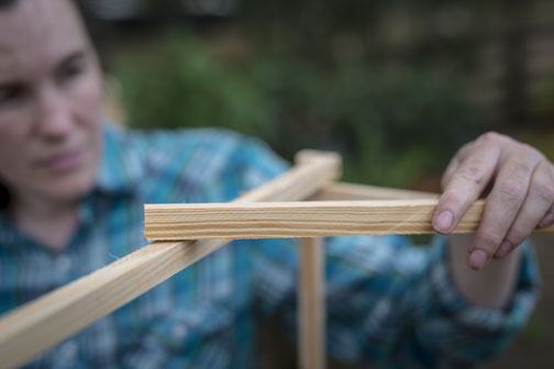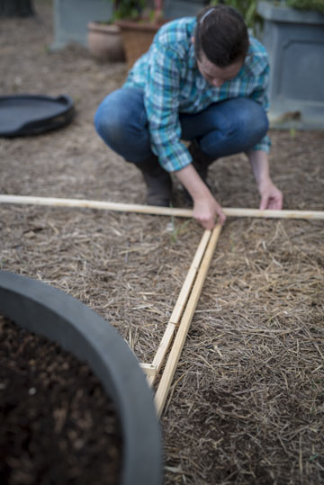 That’s the length of your 4 horizontal pieces. Using a hammer or a drill, attach horizontal to verticals, making two squares. Place in the ground again. Tie hemp rope to bottom supporting piece. Then loop around top and bottom until you reach the next vertical piece. Tie off and start again on the second area.